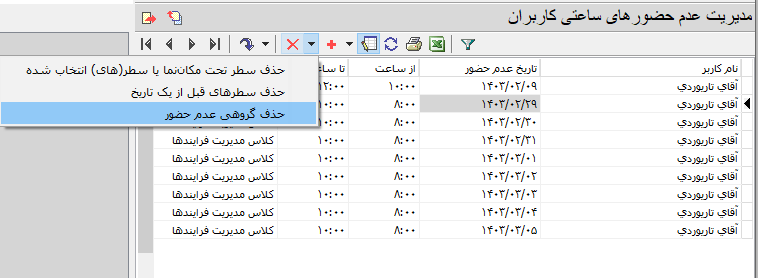 - حذف گروهی عدم حضورها: برای حذف گروهی عدم حضورها، روی آیکون X در نوار ابزار، کلیک کنید و مطابق شکل زیر، از فهرست بازشده، گزینه سوم را کلیک کنید: