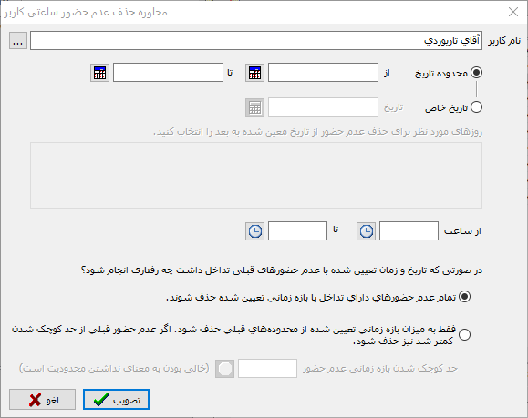 در این محاوره ساعتهای عدم حضور را در یک محدوده تاریخی یا یک تاریخ خاص ثبت می کنیم. اگر ساعتهای عدم حضور در روزهای متوالی تکرار می شود از گزینه محدوده تاریخ استفاده می کنیم. به مثال زیر در این زمینه توجه کنید: