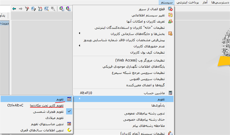 برای این کار، مطابق شکل زیر، از منوی سیستم گزینه تقویم و از منوی بازشده، گزینه تقویم (یا تقویم کاربر تحت مکان نما) را کلیک می کنیم: