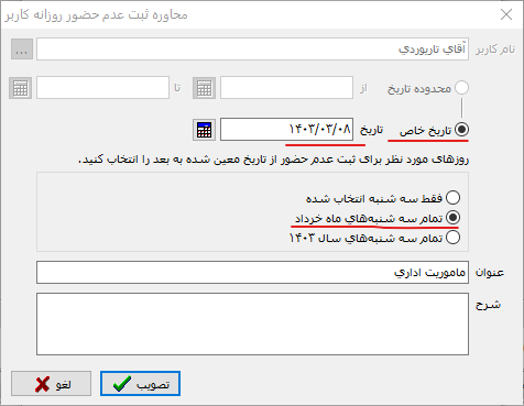 ملاحظه می کنید که این همان محاوره آشنای ثبت عدم حضور روزانه برای یک تاریخ خاص و به شکل گروهی است که در بخشهای قبلی به تفصیل به آن پرداخته شده است. در این مثال، روز سه شنبه 8 خرداد 1403 و تمام سه شنبه های دیگر ماه خرداد به عنوان عدم حضور ثبت می گردد.