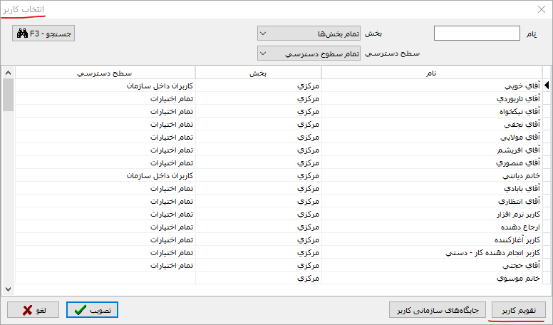 اگر فیلدی از نوع کاربر در یک فرم انجام وظیفه وجود داشته باشد، آنگاه همانند شکل زیر، در محاوره انتخاب کاربر می توانید تکمه "تقویم کاربر" را کلیک کنید: