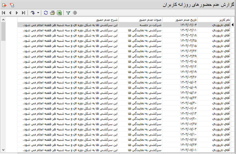در ادامه و با انتخاب کاربر مورد نظر، گزارش عدم حضورهای روزانه، به شکل زیر روی صفحه باز می شود: