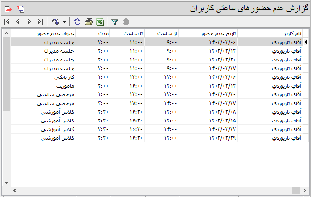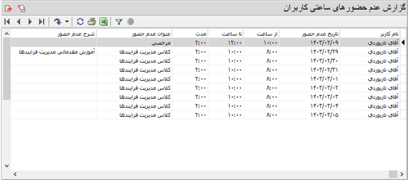 با این کار و سپس انتخاب کاربر مورد نظر، گزارش عدم حضورهای ساعتی به شکل زیر روی صفحه باز می شود: