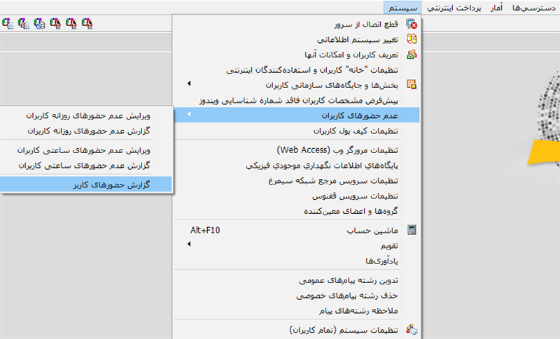 حال فرض کنید مدیر پشتیبانی می خواهد از زمان حضور این کارشناس در روزهای هفته مطلع شود و با توجه به زمان حضور، ماموریتی را برای این کارشناس در نظر بگیرد. واضح است که در چنین شرایطی گزارش حضور کارشناس اهمیت بیشتری پیدا می کند و تصمیم گیری را برای مدیر آسان تر خواهد کرد. بنابراین برای تهیه گزارش حضور این کارشناس همانند شکل زیر، از منوی "سیستم" ، گزینه "عدم حضورهای کاربران" و از فهرست بازشده گزینه "گزارش حضور کاربران" را کلیک می کنیم:
