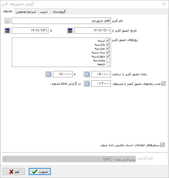 در ادامه، محاوره تنظیمات گزارش حضورهای کاربر به شکل زیر روی صفحه باز می شود: