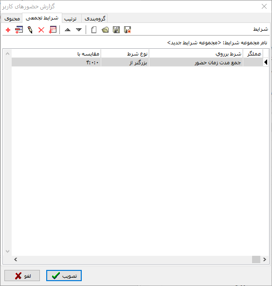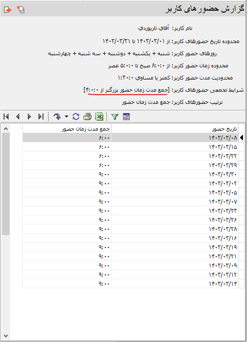 ممکن است برای مدیر، به دلیل ماهیت کار ، تاریخهایی اهمیت داشته باشد که که کارشناس فوق بیش از 4 ساعت حضور دارد، در این صورت می توانید شرایط تجمعی حضورهای کاربر را نیز تعیین کنید. به مثال زیر توجه کنید: