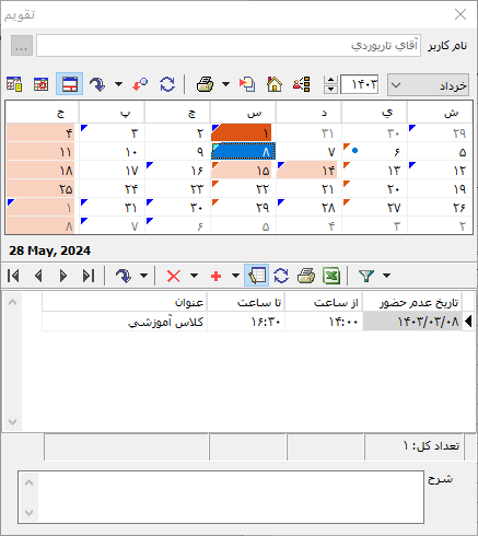 در نوار ابزار این گزارش وجود دارد که با کلیک روی آن، تاریخ تحت مکان نما را در تقویم کاربر نمایش می دهد. برای مثال همانطور که در شکل بالا نشان داده شده است، روی تاریخ 8 خرداد آیکون یادشده را کلیک می کنیم. با این کار تقویم کاربر در این روز به شکل زیر نمایش داده می شود :