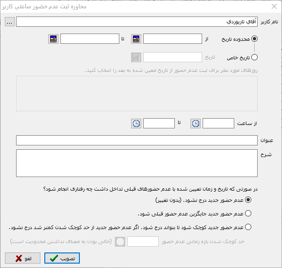 در این محاوره ساعتهای عدم حضور را در یک محدوده تاریخی یا یک تاریخ خاص ثبت می کنیم. اگر ساعتهای عدم حضور در روزهای متوالی تکرار می شود از گزینه محدوده تاریخ استفاده می کنیم. به مثال زیر در این زمینه توجه کنید: