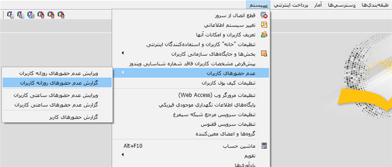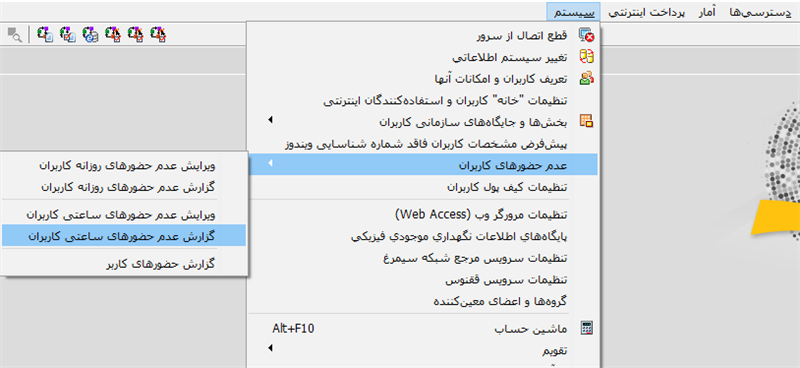حال فرض کنید مدیر پشتیبانی می خواهد از زمان حضور این کارشناس در روزهای هفته مطلع شود و با توجه به زمان حضور، ماموریتی را برای این کارشناس در نظر بگیرد. واضح است که در چنین شرایطی گزارش حضور کارشناس اهمیت بیشتری پیدا می کند و تصمیم گیری را برای مدیر آسان تر خواهد کرد. بنابراین برای تهیه گزارش حضور این کارشناس همانند شکل زیر، از منوی "سیستم" ، گزینه "عدم حضورهای کاربران" و از فهرست بازشده گزینه "گزارش حضور کاربران" را کلیک می کنیم: