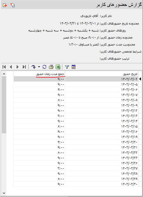 در این مثال، شرط جمع مدت زمان حضور بزرگتر از 4 ساعت تعیین شده است. با اعمال این شرط، گزارش حضور کاربر به شکل زیر به نمایش در می آید: