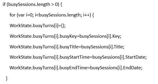 در این قسمت برای امکان نمایش فهرست عدم حضورهای ساعتی (نوبتهای پرشده)، محتوای آرایه خروجی busySessions را (به شرط وجود) به یک فیلد آرایه تعریف شده در گردش کار بنام busyTurns منتقل می کنیم.