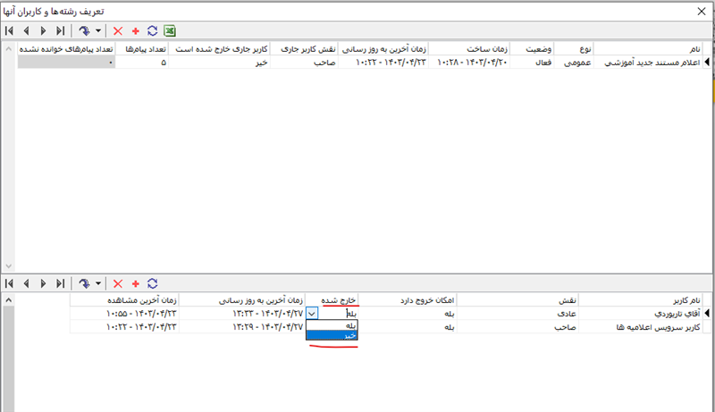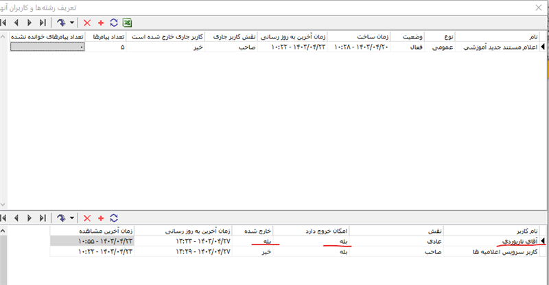 با این کار محاوره ای ظاهر می شود که با تایید آن محاوره، کاربر از رشته پیام خارج می شود. حال اگر این رشته پیام را در محاوره تدوین رشته پیامها ملاحظه کنیم، متوجه می شویم که برای کاربر تاریوردی ، در ستون "خارج شده" عبارت "بله" نمایش داده می شود: