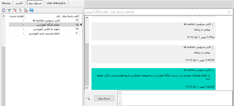 همانطور که در شکل بالا ملاحظه می کنید، کلید رشته پیام اعلام کارگاه آموزشی، 25 می باشد لذا تابع ارسال پیام به شکل زیر خواهد بود: