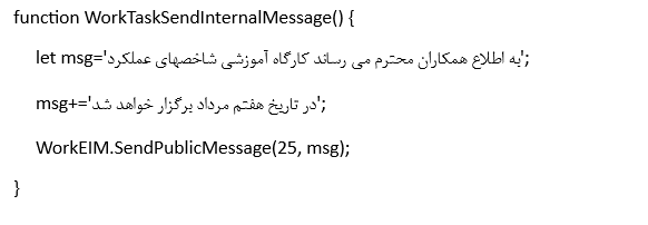 فرض کنید می خواهیم در گردش کار مدیریت آموزش، همزمان با برنامه ریزی یک کارگاه آموزشی، پیامی داخلی برای تمام کارشناسان ارسال شود. برای این کار فرض کنید یک رشته پیام عمومی به نام "اعلام کارگاه آموزشی" وجود دارد و لذا پیام مورد نظر باید به این رشته پیام، ارسال شود. به این ترتیب باید یک تابع اجرایی شبیه به تابع زیر بنویسیم :