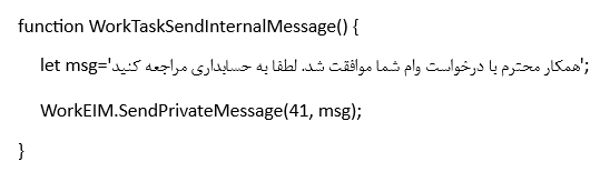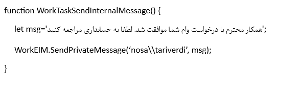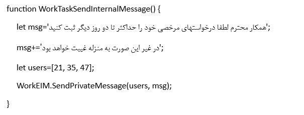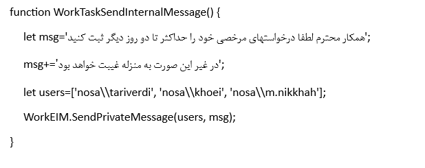 مثال برای کاربران متعدد با نام کاربری : فرض کنید در گردش کار مدیریت امور پرسنلی در مرحله خاصی، پیامی داخلی برای تعیین تکلیف مرخصی های همکاران ارسال می شود. برای این کار می توانید از تابعی شبیه به تابع زیر استفاده کنید: