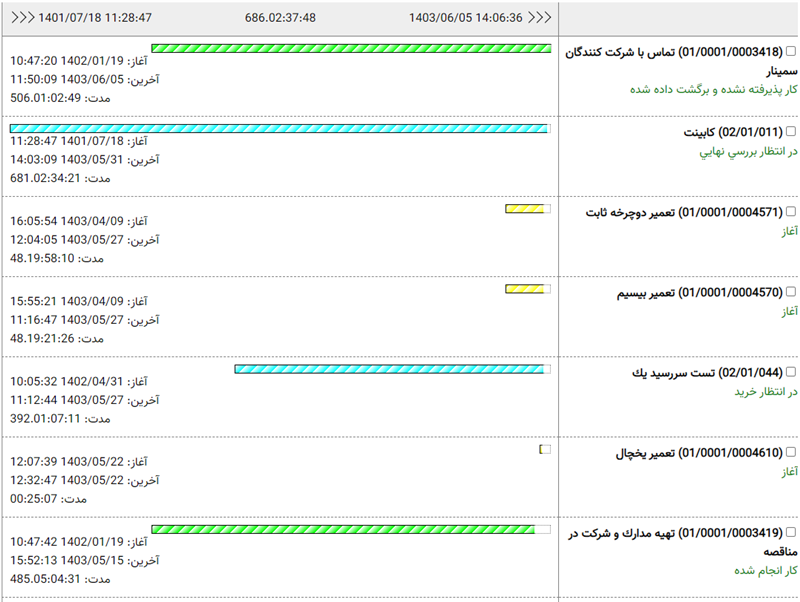 در کلاینت وب، امکاناتی برای نمایش گرافیکی اطلاعات تراکنش کارها پیاده سازی شده است. این امکانات در بخشهای مختلف به شکل نمودارهای متنوع نمایش داده می شود. ابتدا به نمودار میله ای اطلاعات زمانی کار می پردازیم که در فهرست کارها نمایش داده می شود.