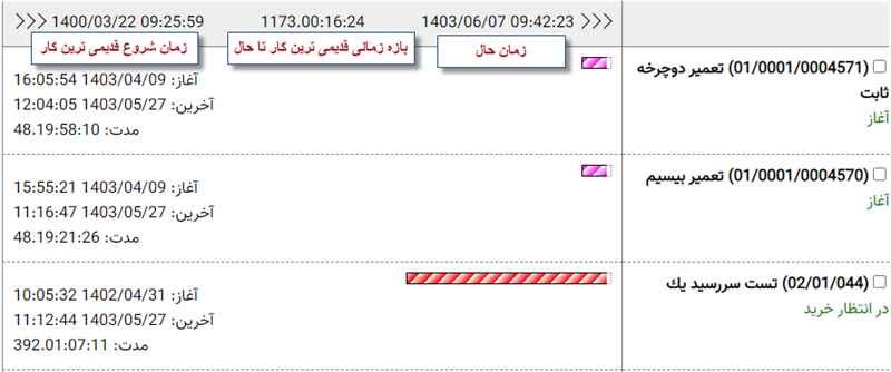 اولین عبارت از سمت چپ، قدیمی ترین تاریخ و زمان شروع کارها در این گزارش است. در مثال بالا، اولین کار در این گزارش، در تاریخ