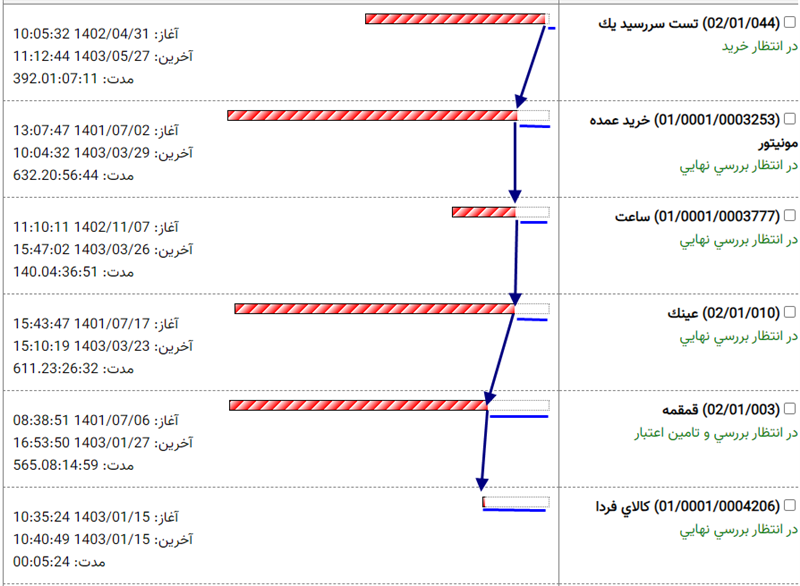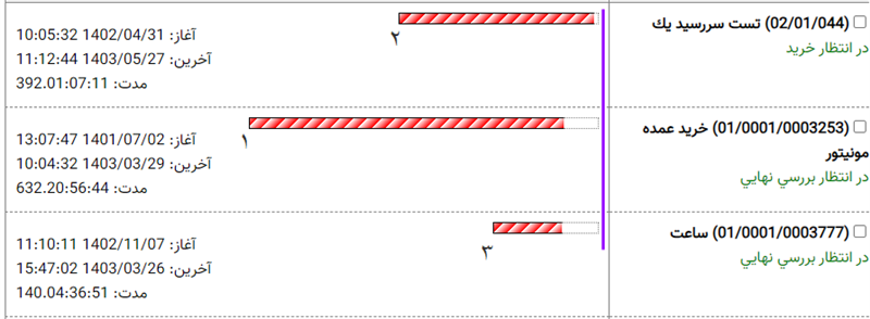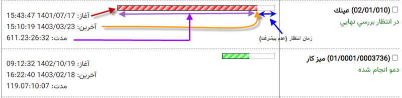 در این فرمت از نمایش، اطلاعات کارها در دو ستون به نمایش درمی آید. در ستون سمت راست، کد و شرح کار به همراه آخرین وضعیت کار و در ستون سمت چپ، اطلاعات زمانی تراکنشهای کارها به همراه یک نمودار میله ای نمایش داده می شود. اولین نکته ای که در مورد این میله ها به چشم می خورد رنگهای مختلف میله هاست که هر رنگ نماینده یک گردش کار می باشد. هدف از این نمودارهای میله ای، نمایش گرافیکی اطلاعات زمانی کار است. در اینجا برای درک بهتر این موضوع، المانهای ستون سمت چپ را با جزئیات کامل شرح می دهیم.