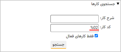اما در مورد مدخل «کد کار» اینچنین نیست و لذا اگر می خواهید زیرشاخه ها یا سرشاخه های کد را جستجو کنید باید علامت % را در ابتدا یا انتهای عبارت جستجو وارد کنید. در این زمینه به مثالهای زیر توجه کنید: