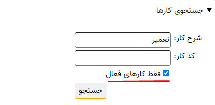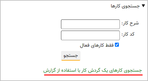 در این قسمت می توانیم از طریق دو مدخل «شرح کار» و «کد کار»، به جستجو در کارها بپردازیم. بدیهی است این جستجو در سطح پایگاه و مستقل از گردش کار انجام می شود. نکته ای که در اینجا باید به آن توجه کنید این است که در مدخل «شرح کار» ، سیستم عبارت جستجو را به همراه یک علامت % در انتها فرض می کند و به این ترتیب تمام واژه هایی که عبارت مورد نظر در ابتدای آنهاست بازیابی می شود.