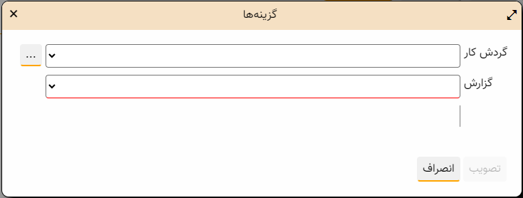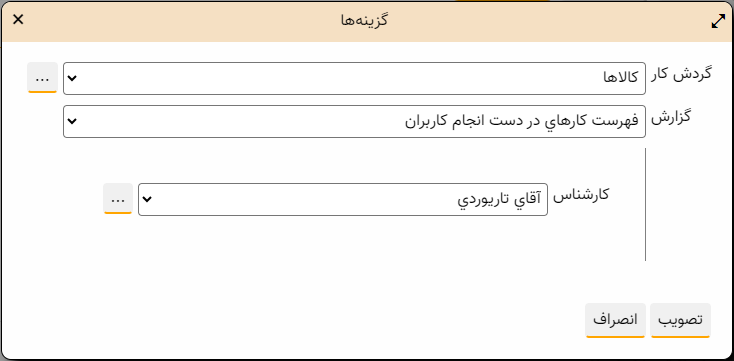 در این محاوره همانند مثال شکل زیر، ابتدا گردش کار را مشخص می کنیم و سپس از میان فهرست کارهای مبتنی بر برنامه تعریف شده در گردش کار، گزارش مورد نظر خود را انتخاب می کنیم :