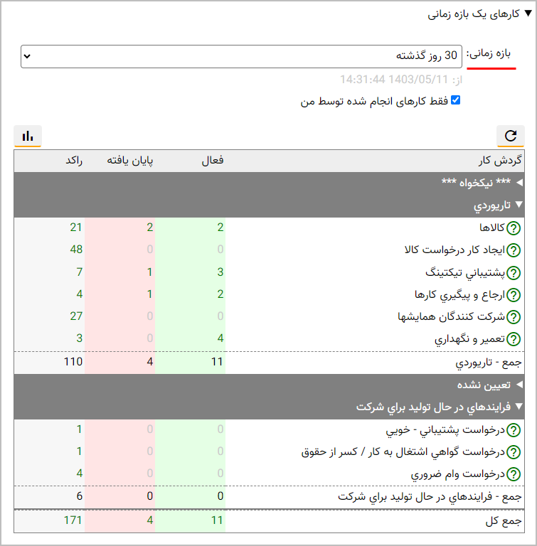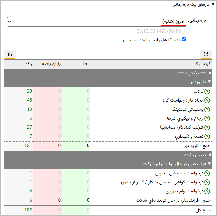همانطور که می بینید، این گزارش بطور پیش فرض کارهای روز جاری (در این مثال شنبه) را نشان می دهد. در این گزارش، گردش کارها براساس نام دسته بندی کارها طبقه بندی شده است و در هر دسته، کارهای فعال، پایان یافته و راکد به تفکیک گردش کار نمایش داده می شود.