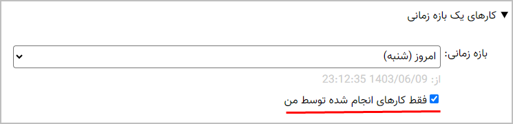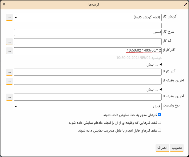 ملاحظه می کنید که فیلدهای «شرح کار» و «نوع وضعیت»، متناظر با تنظیمات وارد شده در بخش جستجوی کار، پر شده است. حال فرض کنید می خواهیم کارهای آغاز شده در هفته جاری را گزارش بگیریم برای این کار، کافی است همانند شکل زیر، در فیلد «آغاز کار از»، تاریخ مورد نظر خود را انتخاب کنیم: