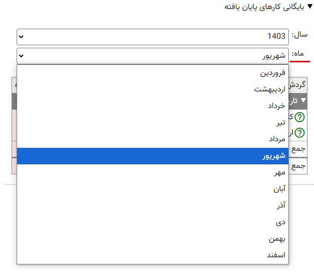 در این قسمت می توانید گزارش کارهای خاتمه یافته و لغو شده را در یک ماه خاص از یک سال خاص مشاهده کنید. محاوره بایگانی کارهای پایان یافته به شکل زیر است: