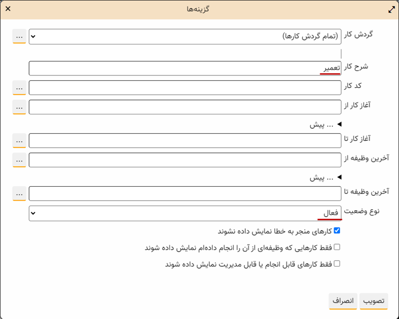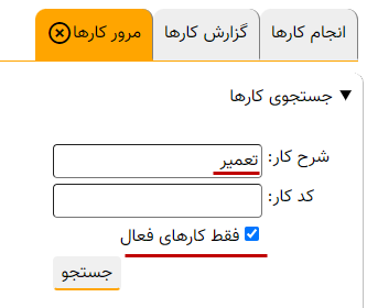 برای این کار، همانند شکل زیر، در قسمت جستجوی کارها عبارت «تعمیر» را در شرح کار جستجو می کنیم: