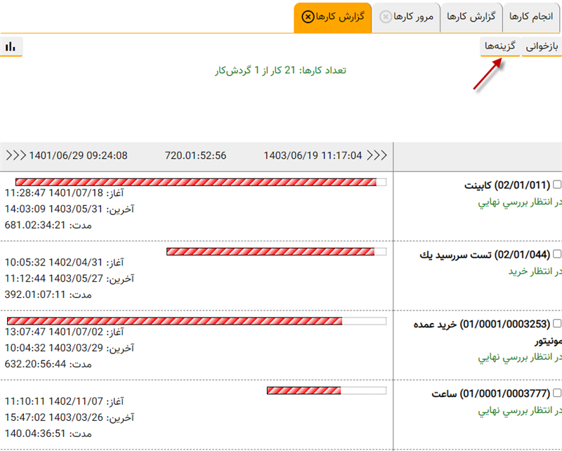 همانطور که ملاحظه می کنید، مرور کارها از سه بخش «جستجوی کارها»، «کارهای یک بازه زمانی» و «بایگانی کارهای پایان یافته» تشکیل شده است که در ادامه مطلب با جزئیات کامل شرح داده می شود.