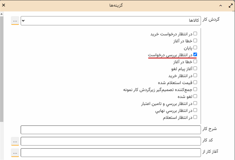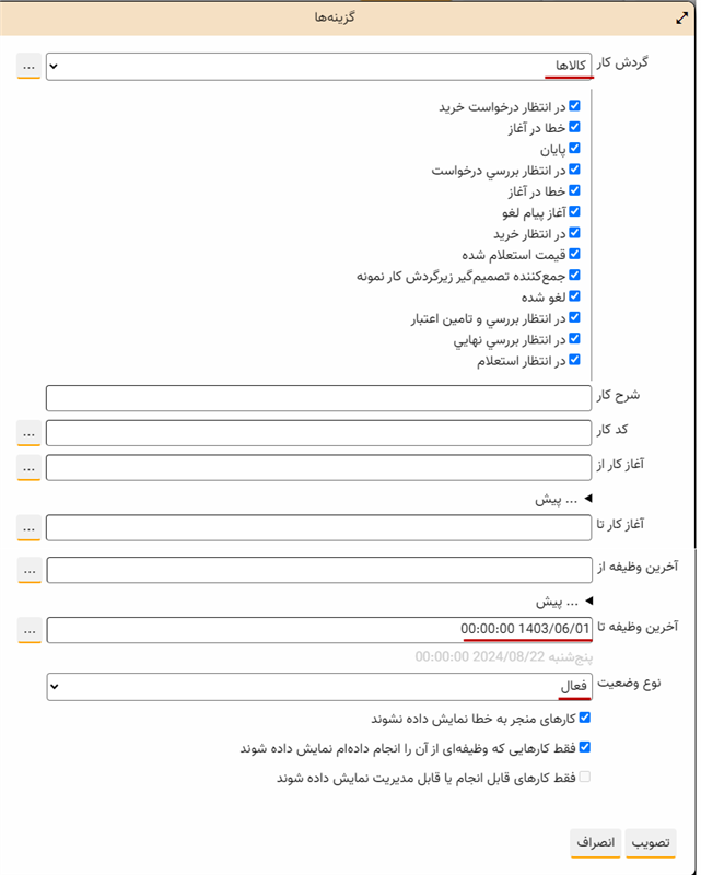 ملاحظه می کنید که در فیلد «آخرین وظیفه تا»، تاریخ اول این ماه (در این مثال شهریور) قرار گرفته است یعنی از این تاریخ به بعد هیچ وظیفه ای در کارها انجام نگرفته است. ضمنا گردش کار به کالاها و «نوع وضعیت» نیز به کارهای «فعال» محدود شده است. حال فرض کنید بخواهیم این گزارش را محدود به کارهای در وضعیت «در انتظار بررسی درخواست» کنیم. برای این کار کافی است وضعیتهای دیگر را مطابق شکل زیر غیر فعال کنیم: