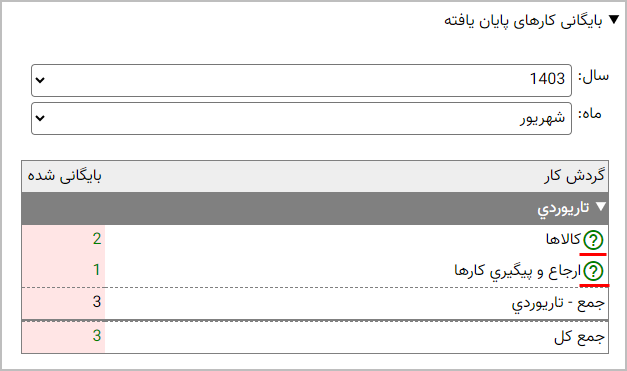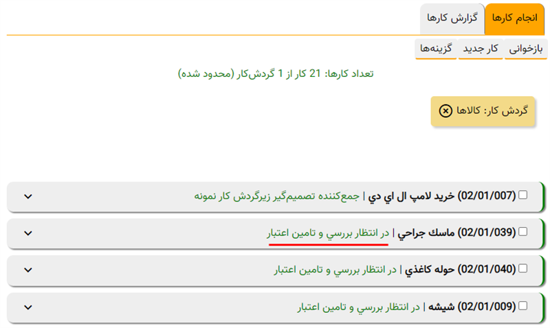 مثال 2: کارهای راکد گردش کار «کالاها» در بازه زمانی ماه جاری