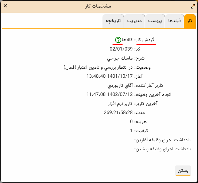 ملاحظه می کنید که در این محاوره، یکی از مشخصات کار، نام گردش کار و در کنار آن آیکون