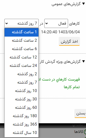 در قسمت گزارش کارها که قبلا و در یک مستند جداگانه توضیح داده شده است، امکان استفاده از بازه های 7 روزه به شکل پیش فرض و نیز تعیین بازه های زمانی به شکل کاملا دلخواه وجود دارد. اما برای تجربه کاربری بهتر و دسترسی سریعتر به گزارش مورد نظر، در این بخش بازه های زمانی از پیش تعریف شده توسعه پیدا کرده است و سعی شده است تا جای ممکن، بیشترین و پرکاربردترین بازه های زمانی معمول پوشش داده شود.