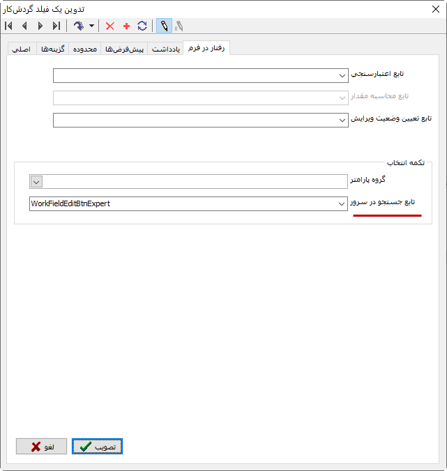 در این مدل، برخلاف مدل قبلی، گروه پارامتر و فرم ورود اطلاعات فیلدهای گروه پارامتر وجود ندارد و محدود کردن فهرست داده ها، تنها از طریق تابع جستجوی پارامتریک انجام می شود. برای این کار کافی است در محاوره تدوین یک فیلد گردش کار و در زبانه «رفتار در فرم» در بخش تنظیمات تکمه انتخاب، همانطور که در شکل زیر نشان داده شده است، تنها «تابع جستجو در سرور» را تعیین کنید.