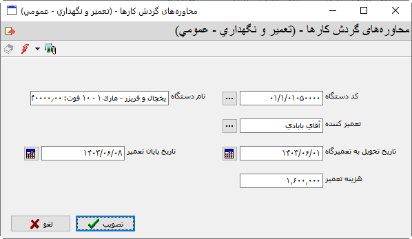 در این حالت نسبت به فیلدهای انتخابگر تعمیرکننده و دستگاه، رشته حرفی FormFieldsJson به شکل زیر است: