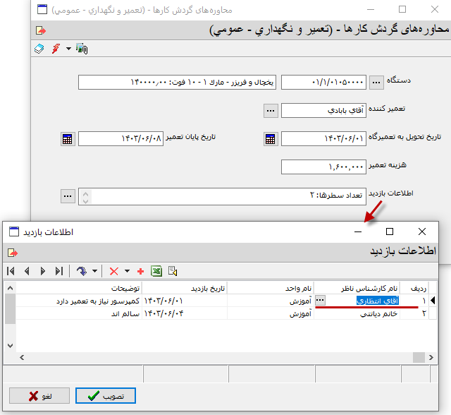 برای مثال در فرم زیر، فیلد «کارشناس ناظر» یکی از اجزای آرایه «اطلاعات بازدید» است.