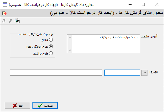 این منابع دیجیتال در یک گردش کار بنام «مدیریت حمل و نقل» استفاده می شود. به این صورت که در این گردش کار، در فرم زیر آدرس مقصد و وضعیت طرح ترافیک مقصد تعیین می شود: