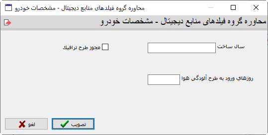 ملاحظه می کنید که در گروه فیلدهای منبع دیجیتال خودرو، برای هر خودرو سال ساخت و مجوز طرح ترافیک خودرو قابل تعیین است. توضیح این که اگر خودرو مجوز طرح ترافیک داشته باشد، فیلد «مجوز طرح ترافیک» تیک می خورد و در غیر این صورت خودرو تنها به تعداد روز معینی (مثلا 3 روز) می تواند وارد محدوده آلودگی هوا شود. لذا برای این نوع از خودروها تعداد روزهای ورود به طرح آلودگی هوا ثبت می شود.