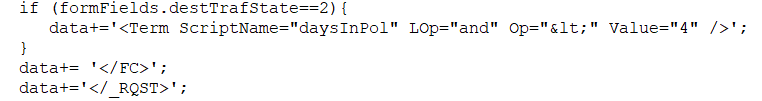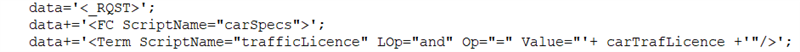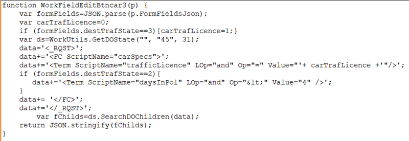 از آنجایی که می خواهیم فرزندان منبع دیجیتال خودروها را جستجو کنیم لذا طبق تعریف نیاز به تولید یک متغیر به فرمت XML داریم. در این متغیر که data نام دارد، در سطر سوم مشخص می کنیم که فیلد مجوز طرح ترافیک خودرو (trafficLicense) باید برابر با متغیر carTrafLicence باشد که در قسمتهای قبل و براساس فیلد وضعیت فیلد طرح ترافیک مقصد (destTrafState) در فرم، محاسبه شده است.