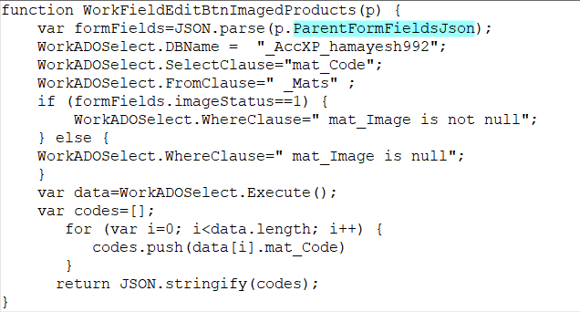 در این حالت، فیلد وضعیت عکس کالا نسبت به انتخابگر حرفی در خارج از آرایه و در ParentFormFieldsJson قرار می گیرد. تابع جستجوی پارامتریک در این حالت بجز سطر اول که رشته حرفی JSON حاوی مقادیر فیلدها در فرم انجام وظیفه را تعیین می کند، دقیقا مشابه با مثال قبلی است. این مورد در تابع زیر با رنگ آبی مشخص شده است: