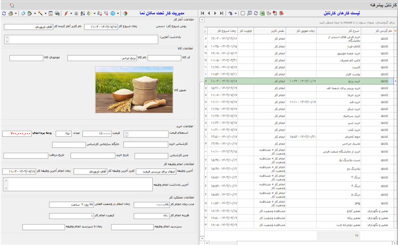 ناحیه سمت چپ کارتابل پیشرفته، در واقع همان محاوره مدیریت کارهاست با این تفاوت که قرار است فقط یک کار یعنی کار تحت مکان نما مدیریت شود. همانطور که از قبل با محاوره مدیریت کارها آشنا هستید این محاوره شامل یک فرم فهرست کارها (به همراه فیلدهای قابل تعریف) است که در این مورد بخصوص باید طوری طراحی شود که مناسب مدیریت یک کار خاص باشد. بدیهی است که فرمهای نمایش جدولی برای این کار مناسب نیست و تنها یک سطر از این ناحیه را استفاده می کند لذا برای استفاده بهینه از این ناحیه، باید فرمی غیرجدولی طراحی شود که که از کل فضای این ناحیه استفاده کند و حداکثر اطلاعات کار را نمایش دهد. نمونه ای از این فرم را در شکل زیر ملاحظه می کنید: