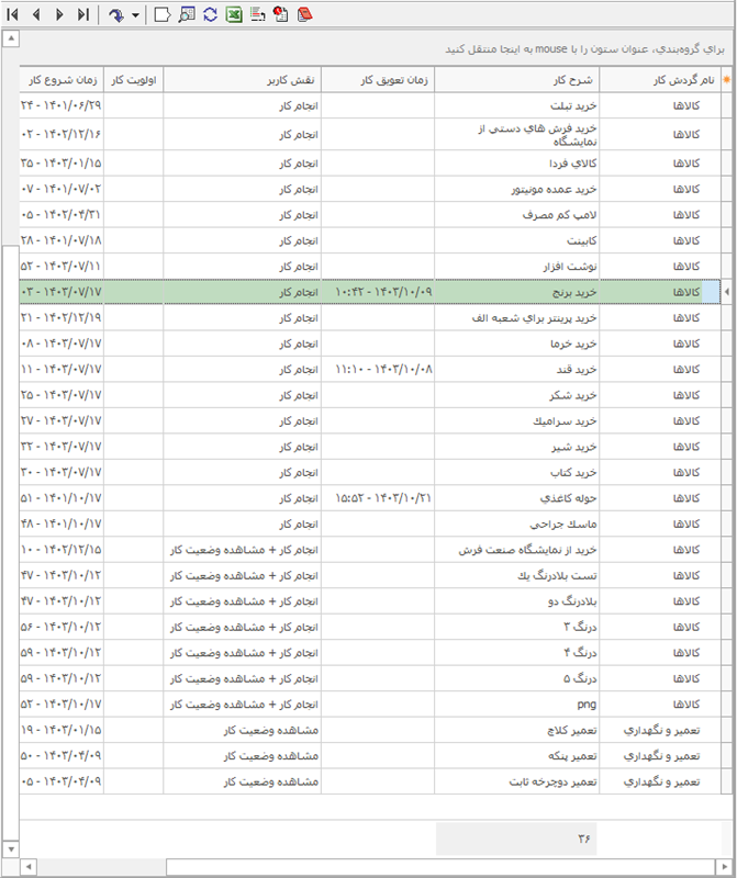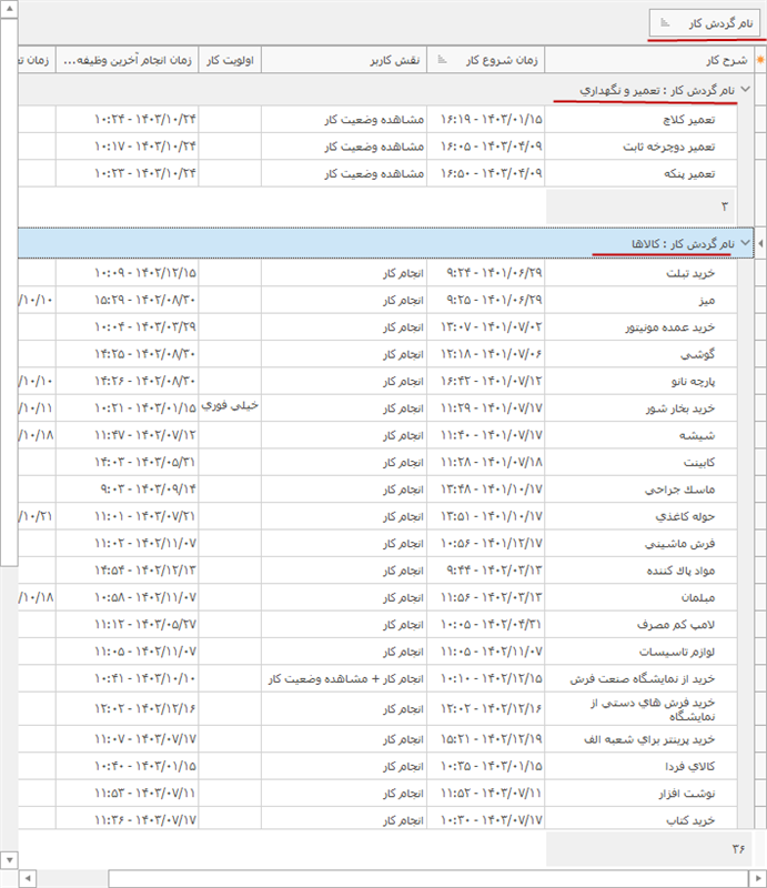 - طبقه بندی کارها: لیست کارها را می توانید براساس هر ستون دلخواه طبقه بندی کنید، برای این کار کافی است عنوان هر ستون را با mouse به ناحیه گروه بندی منتقل کنید. در مثال زیر، کارها براساس گردش کار طبقه بندی شده است: