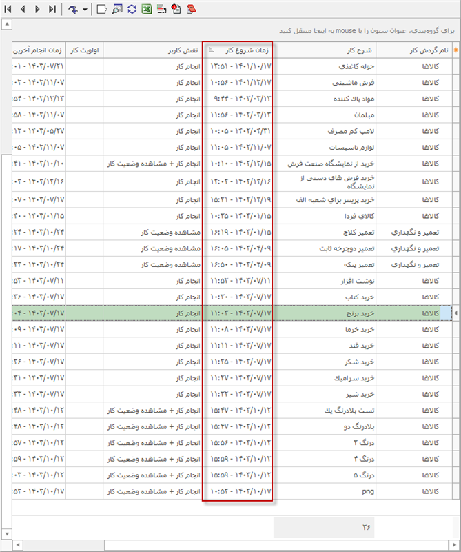 - مرتب سازی دلخواه کارها: روی عنوان هر ستون که کلیک کنید، لیست کارها بر مبنای آن ستون و به شکل صعودی مرتب می شود و با کلیک مجدد، مرتب سازی به شکل نزولی انجام می شود. در مثال زیر، کارها براساس زمان شروع کار و به شکل صعودی مرتب شده است: