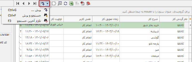 - جستجوی کارها: یک مزیت بسیار مهم و مفید در جدول کارها، امکان جستجوی کارهاست. ابزار جستجو در شکل زیر نشان داده شده است: