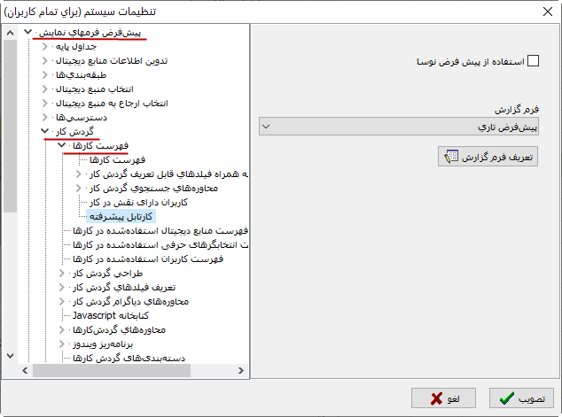 توضیح: این فرم قابل تعریف است و برای ایجاد یا ویرایش فرم دلخواه خود می توانید از طریق منوی سیستم -> تنظیمات سیستم (همه کاربران) محاوره تنظیمات سیستم را باز کنید و در این محاوره مطابق مسیر شکل زیر، روی گزینه کارتابل پیشرفته کلیک کنید و فرم مورد نظر خود را ایجاد یا ویرایش کنید: