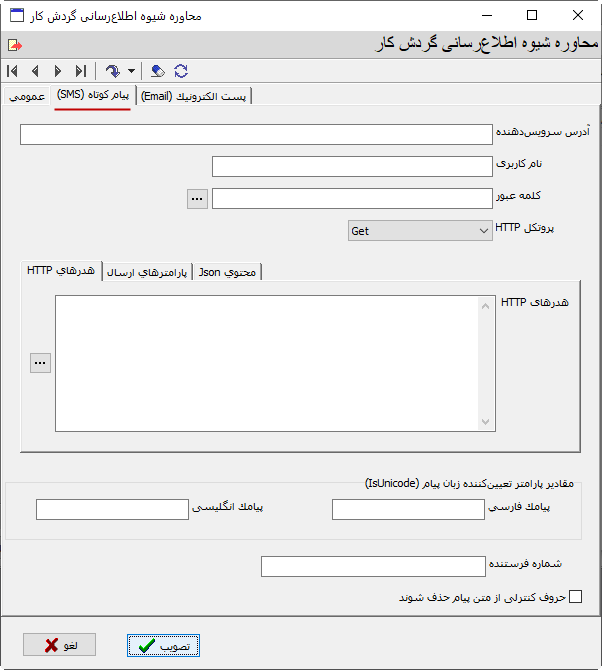 تنظیمات برگه پیام کوتاه (SMS)