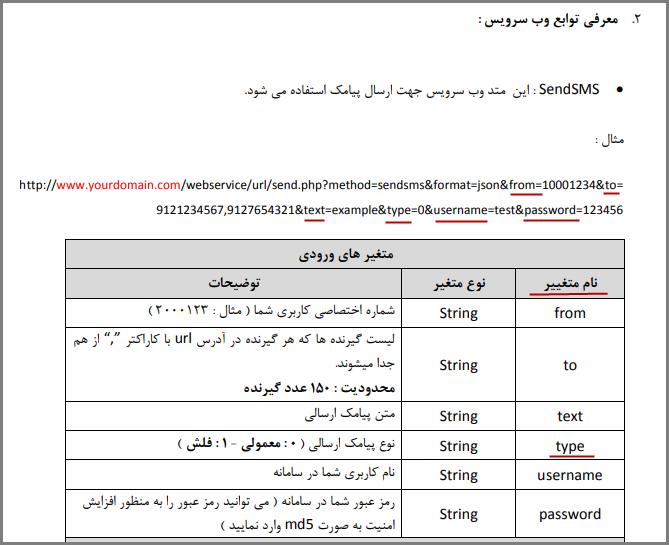 ملاحظه می کنید که در این مثال اگر پارامتر isfarsi مقدار 1 بگیرد به این معنی است که پیامک فارسی است.