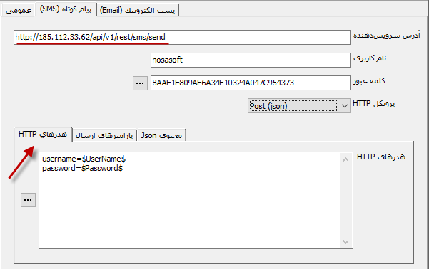 ملاحظه می کنید که بنابر مستندات فوق، آدرس پایه سرویس وب در قسمت آدرس سرویس دهنده و نام کاربری و کلمه عبور نیز در برگه «هدرهای http» وارد شده است.