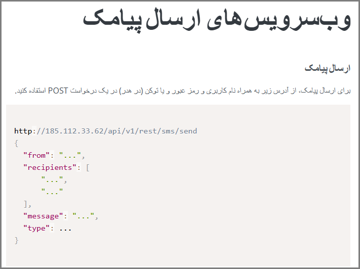 وب سرویس REST: در مستندات شرکت ایده پیام، آدرس سرویس دهنده و روش احراز هویت به شکل زیر اعلام شده است: